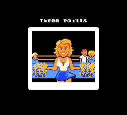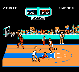 The graphics do decent job of trying to match the coin-op. The sprties aren't very detailed except for some small touches to differentiate them, but they do have good animation, especially after you nail them or grab their shorts. Some flicker does pop up when too many sprites bunch together, but it's nothing serious. This port does feature the still scenes from the arcade original that show up after every score, and they look pretty good. The background music only has one tune that sounds like the coin-op, but it is pretty nice to listen to and never gets old. Some of the cut scenes have snippets of other basketball tunes which are also fun to listen to. The sound effects aren't as good, sounding more like generic NES FX heard in other games, and none of the voice clips from the arcade game made it over.