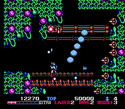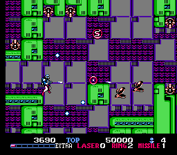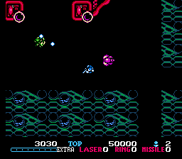 This game uses the same basic story that most shooters use. Once again the universe is threatened by an evil race of beings (in this case the Burai) out to conquer all known life, and once again you're the only hope the universe has. This game features seven stages and you can pick from three difficulty levels. Five of the stages are side-view auto-scrolling affairs that have you guiding a space fighter through a fortess crawling with enemies and obstacles. Your fighter has the ability to move and shoot in 8 different directions and can make use of one of three types of special weapons, depending on the icon you pick up. You can choose from the Ring weapon which can penetrate walls, the Laser Weapon that fires a steady line, and the Missile weapon for powerful missiles. You can switch weapons by picking up different icons but you can also keep collecting the same icon to upgrade your current weapon to different levels. You can also collect a speed power-up to make you guy move faster and can get a rotating orb that acts like a shield, plus you can collect little red fragemtns to form cobalt bombs that destry all enemies on the screen. In addition some levels have hidden rooms you can find that contain special bonuses. However one hit will kill your guy, and you lose the special weapon you were using. When you reach the end of the level you have to battle the boss in order to proceed to the next stage, and passwords help record your progress. Stages 3 and 6 are overhead-view levels where you try to search out an enemy base and take out the turrets to blow it up. The base is in a random spot every time you start the stage so you must study the map screen to see where to search it out.