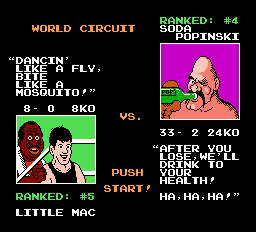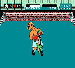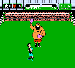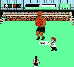 In this game you you try to box your way through the ranks of the WVBA, fighting in 13 matches in the Minor, Major and World circuits against the likes of Glass Joe, King Hippo, The Bald Bull in and many others from around the globe. Under WVBA rules each match lasts three 3-minue rounds, and to win each fight you need to knock each fighter down for a count of 10, or three times in a round for a TKO. Mac can use several high punches and body blows, but to conquer each boxer you need to learn their weakness and dodge their punches so you can counter-punch them. You have a heart meter (your fighting spirit) which goes down every time you get hit or your punch is blocked. Once you're down to zero, you'll become too tired to punch and all you can do is dodge until you recover some hearts. If you land an effective punch, you may get a star which awards you with a powerful uppercut. Knock an opponent down and the referee (our old buddy Mario!) will make the count. You win if your enemy stays down for a 10 count or you knock them down three times for a TKO. If the fight lasts all three rounds, you can also win by referee's decision if you score enough points (but there are some fighters that can't be beaten this way). The last fight in each circuit pits you against its champion in a bout for the circuit title. You have to defeat Piston Honda for the Monor Circuit title, Bald Bull for the Major Circuit title, and Super Macho Man for the World Circuit championship. If you can beat them and win all three titles, you get to enter the Dream Fight against the heavyweight titan himself, Mike Tyson.